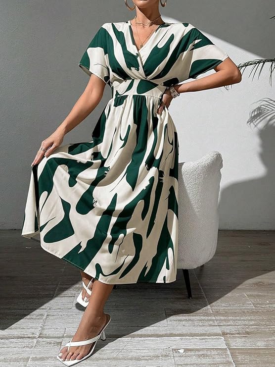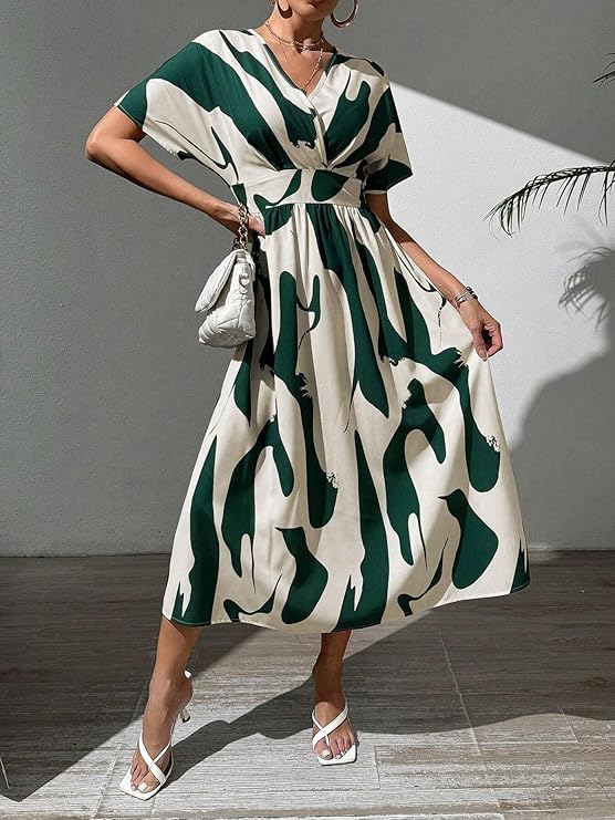 Material typeRayonLengthMidiOccasion typePartySleeve typeHalf SleevePatternPrintedStyleFit And FlareCountry of OriginIndia